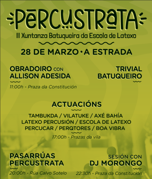 • 17.00 h polas prazas da vila actuacións de: Tambukda | Vilatuke | Axé Bahía | Latexo Percusión | Escola de Latexo | Percucar | Perqtores | Boa vibra