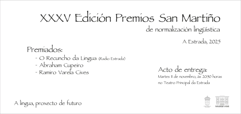 O Teatro Principal da Estrada acolle esta noite o acto de entrega dos premios San Martiño 2025 á normalización da lingua nun sinxelo acto que terá lugar ás 20.30 horas.