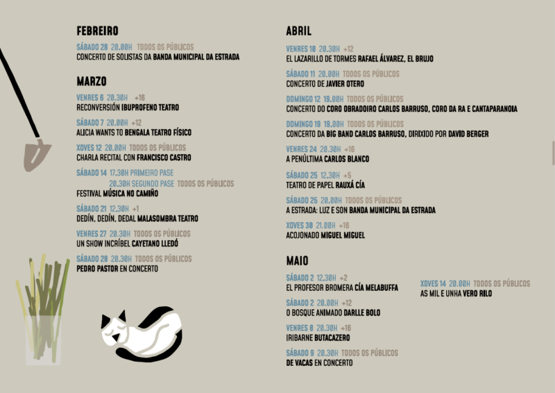 Velaquí o resumo do programa para estes meses e tamén o cartel, deseñado pola ilustradora estradense Rosa de Cabanas.